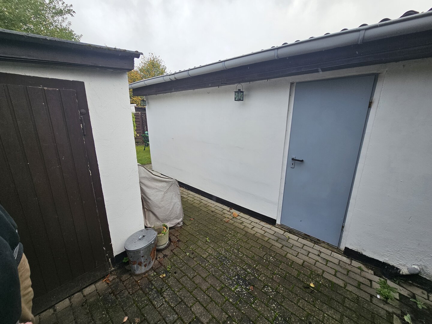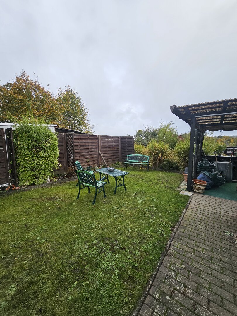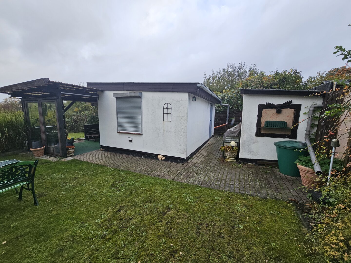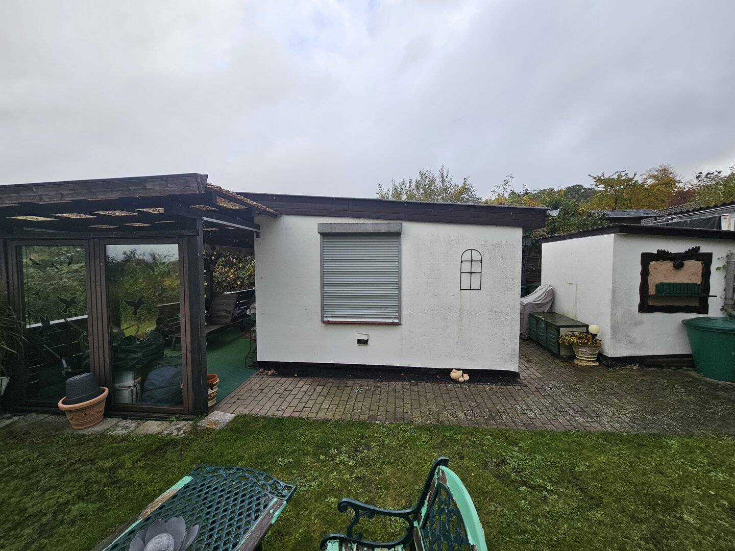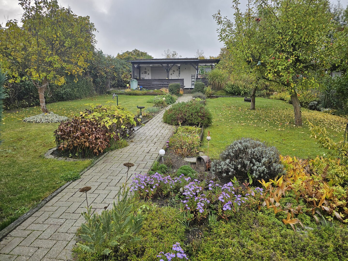 Gepflegter Garten mit ca. 400qm Fläche und einer Gartenlaube in massiver Bauweise aus Stein.