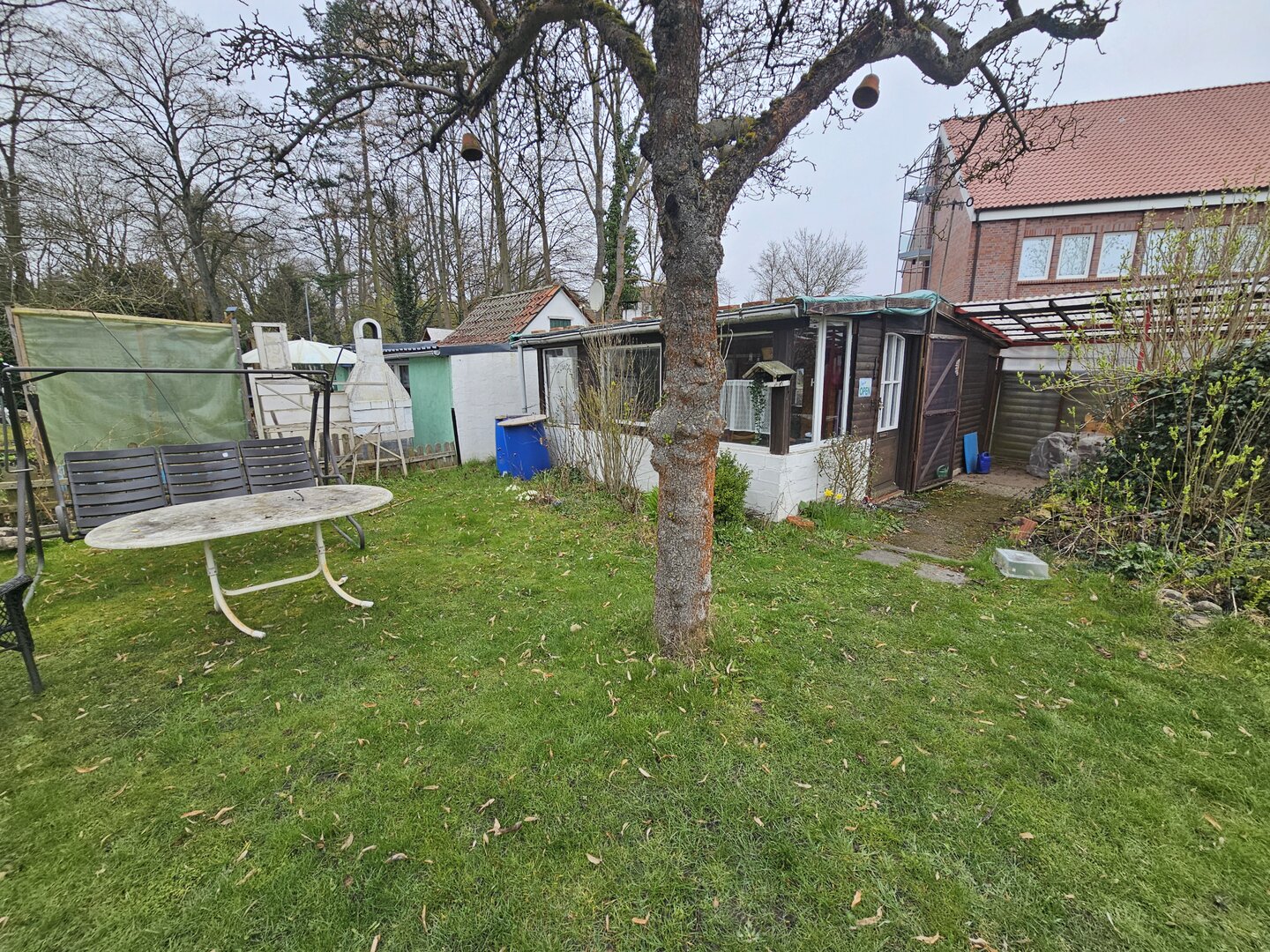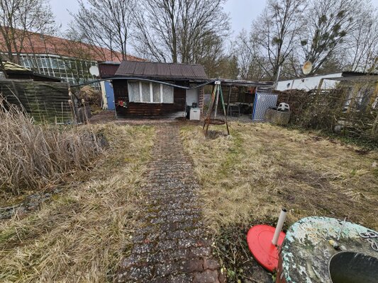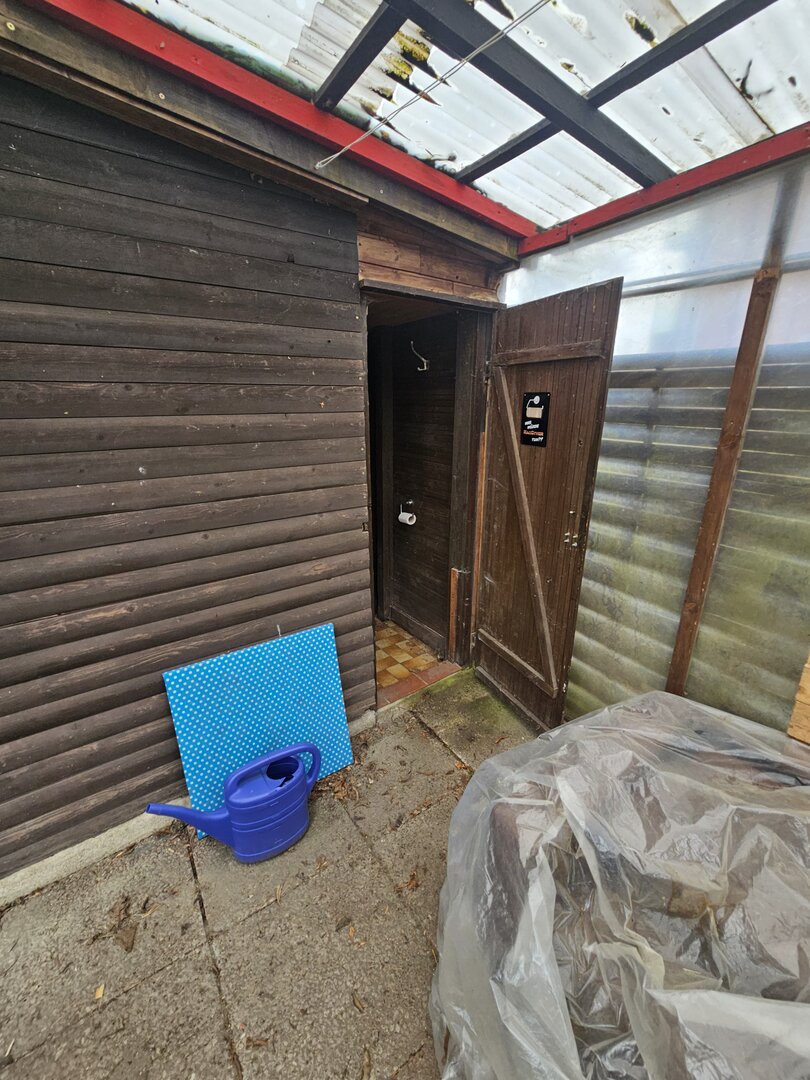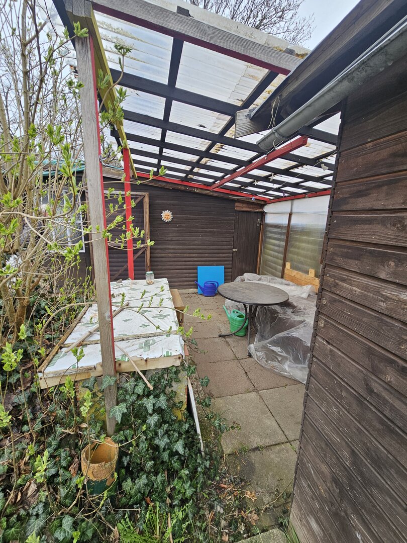 Auf dem Grundstück befindet sich eine Gartenlaube in Holzbauweise.