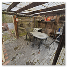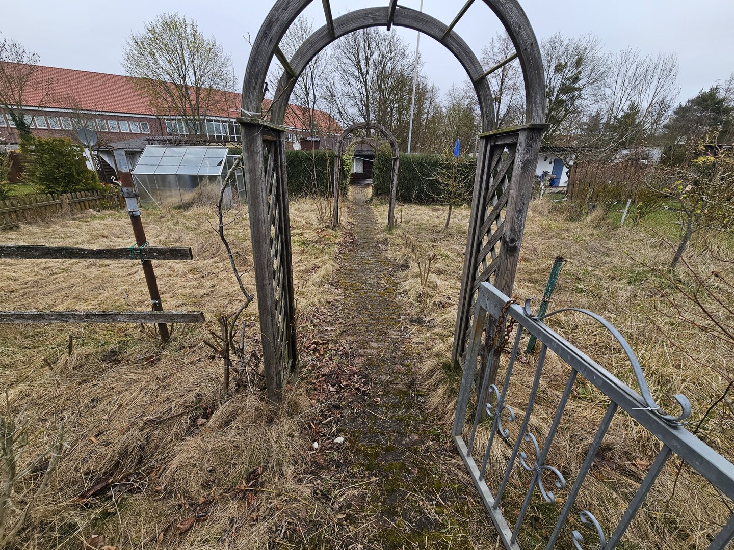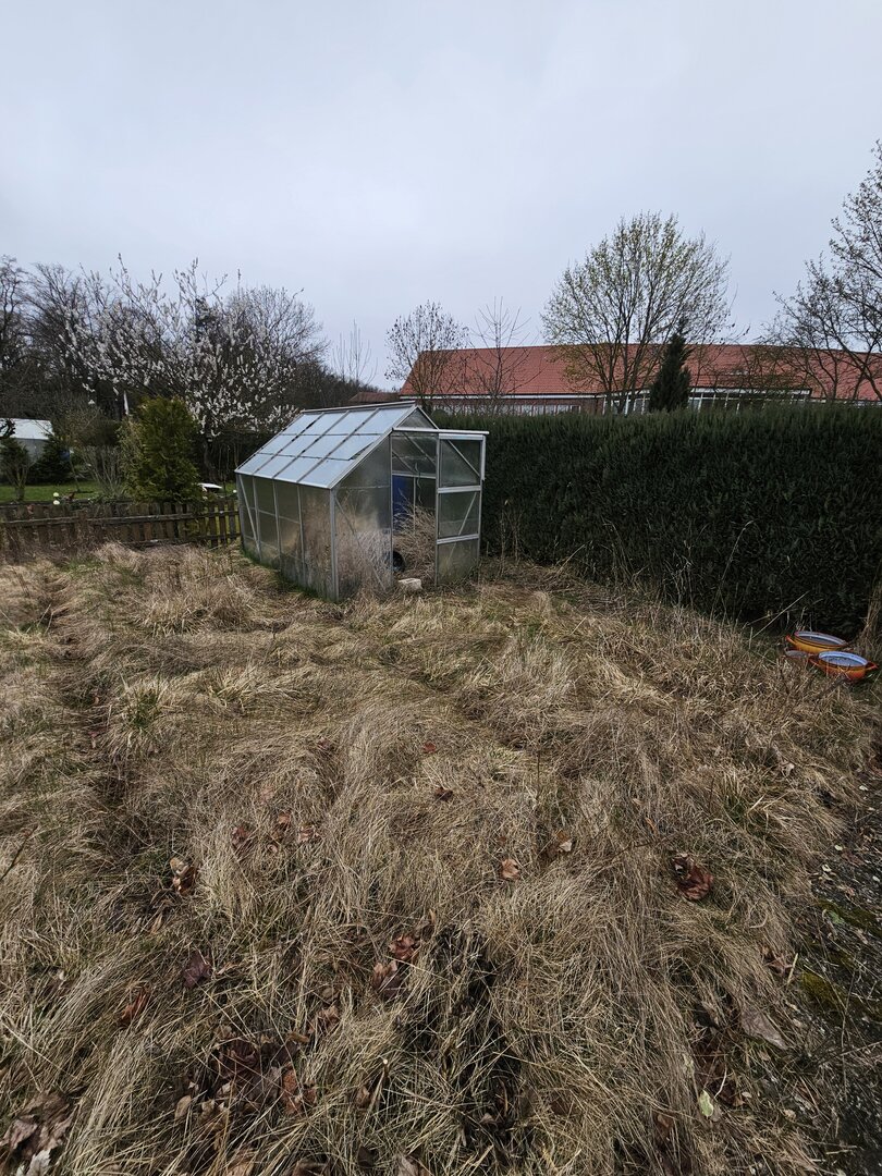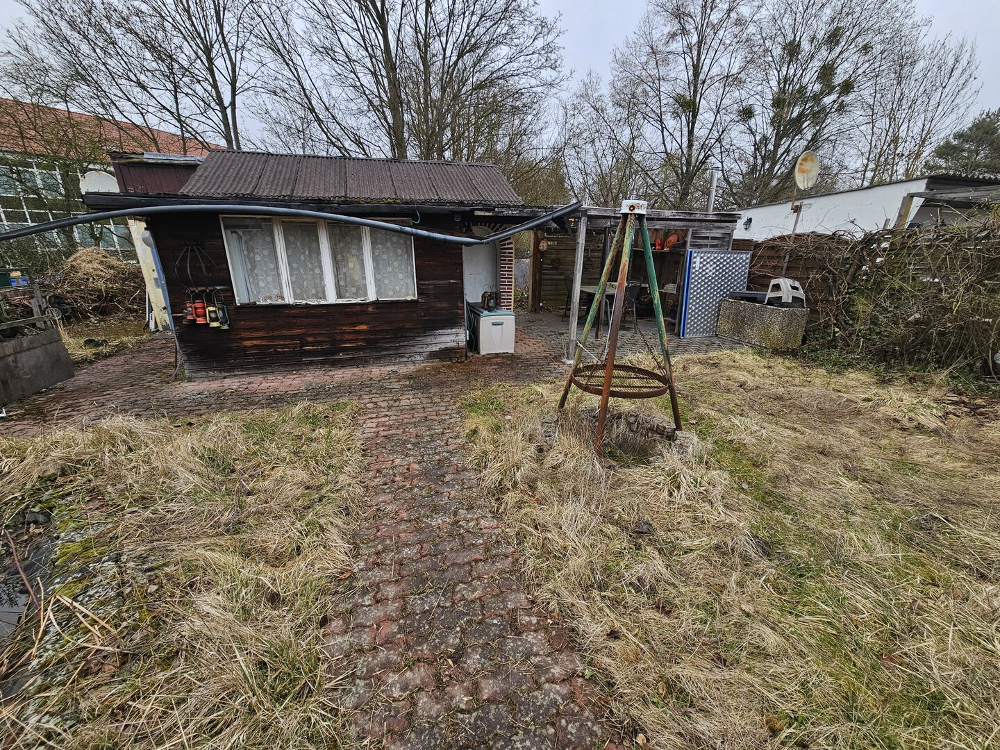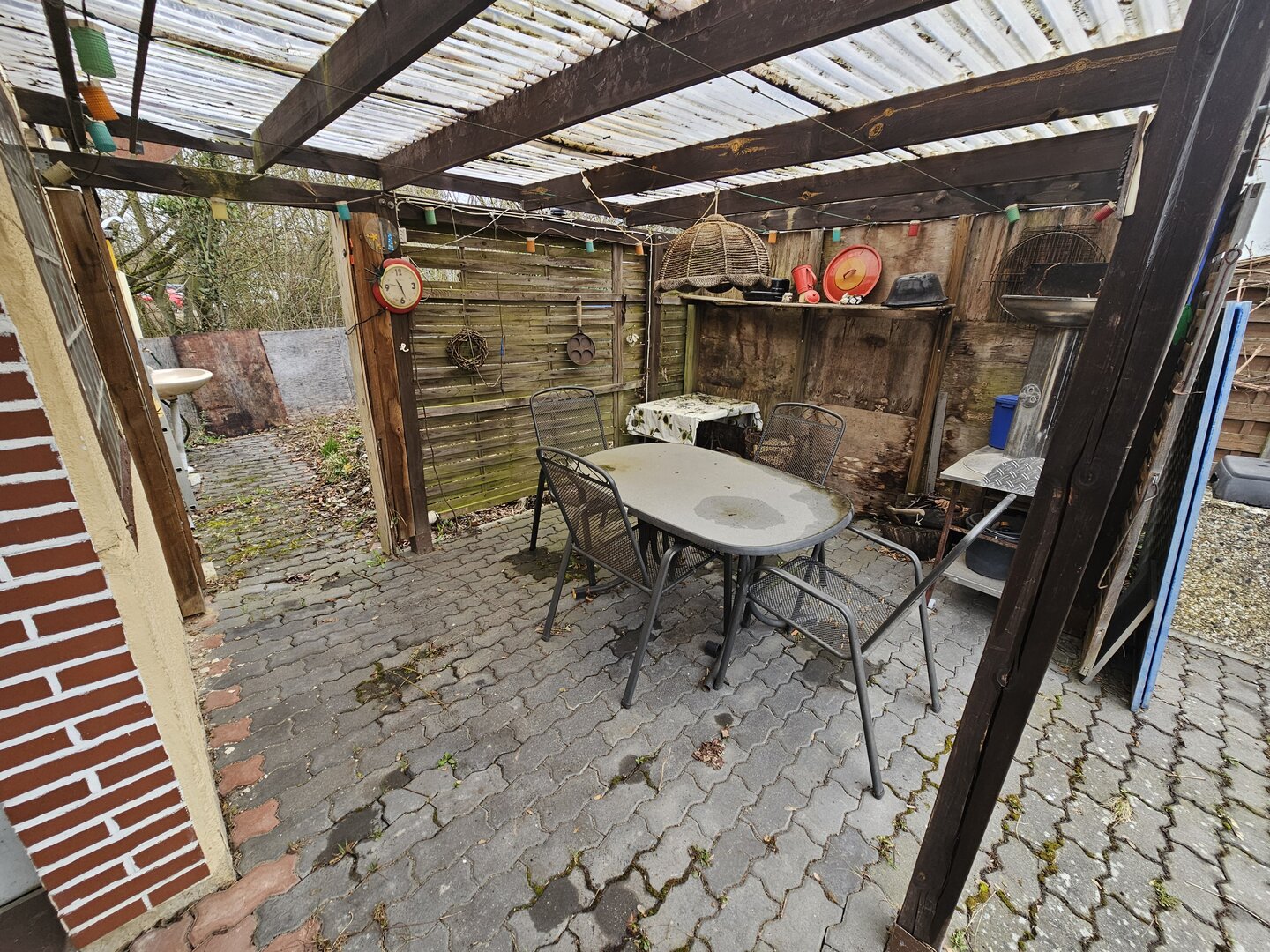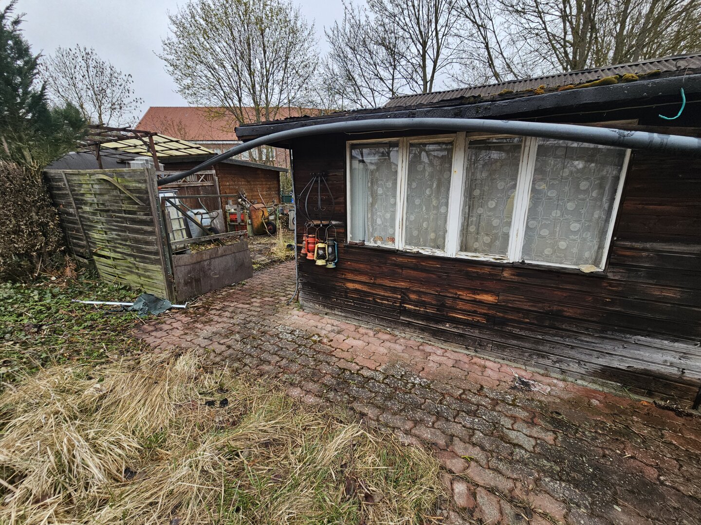 Die Laube ist insgesamt renovierungsbedürftig, jedoch ist das Hauptdach dicht – eine solide Basis für eine Sanierung.