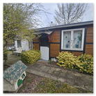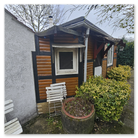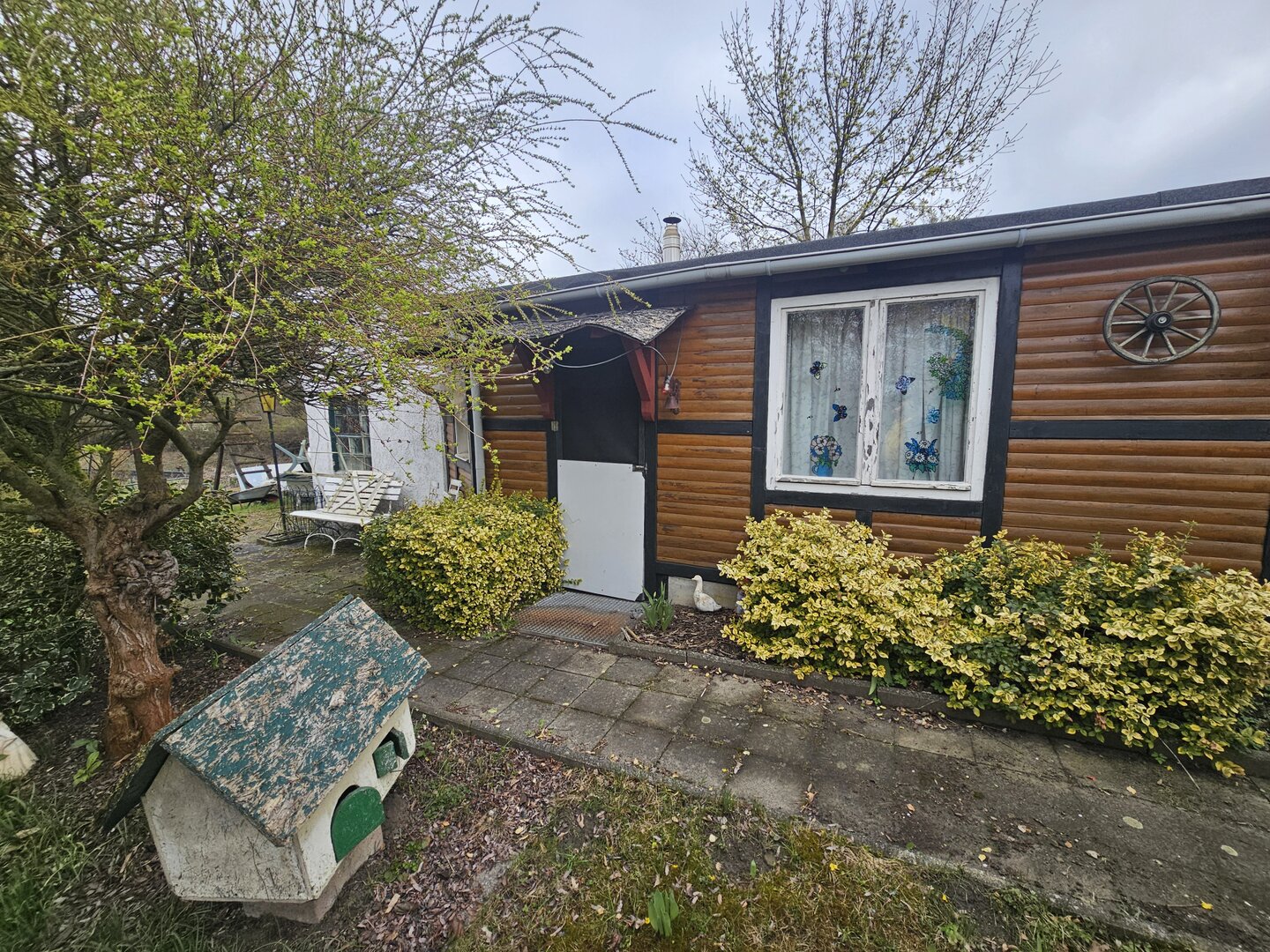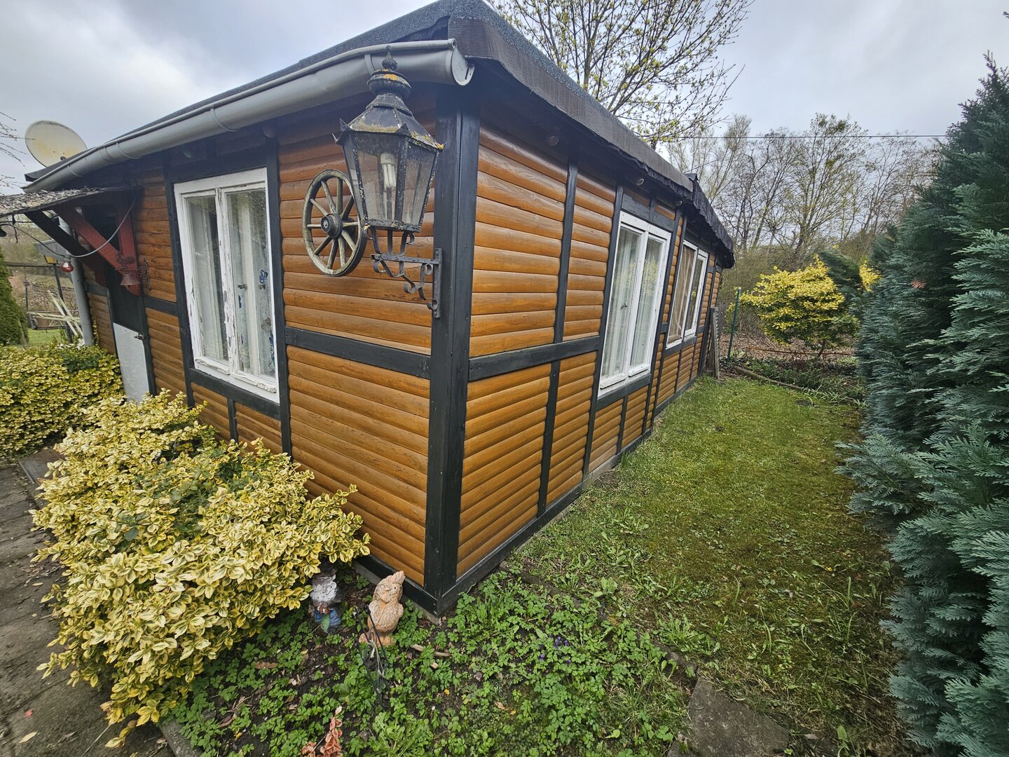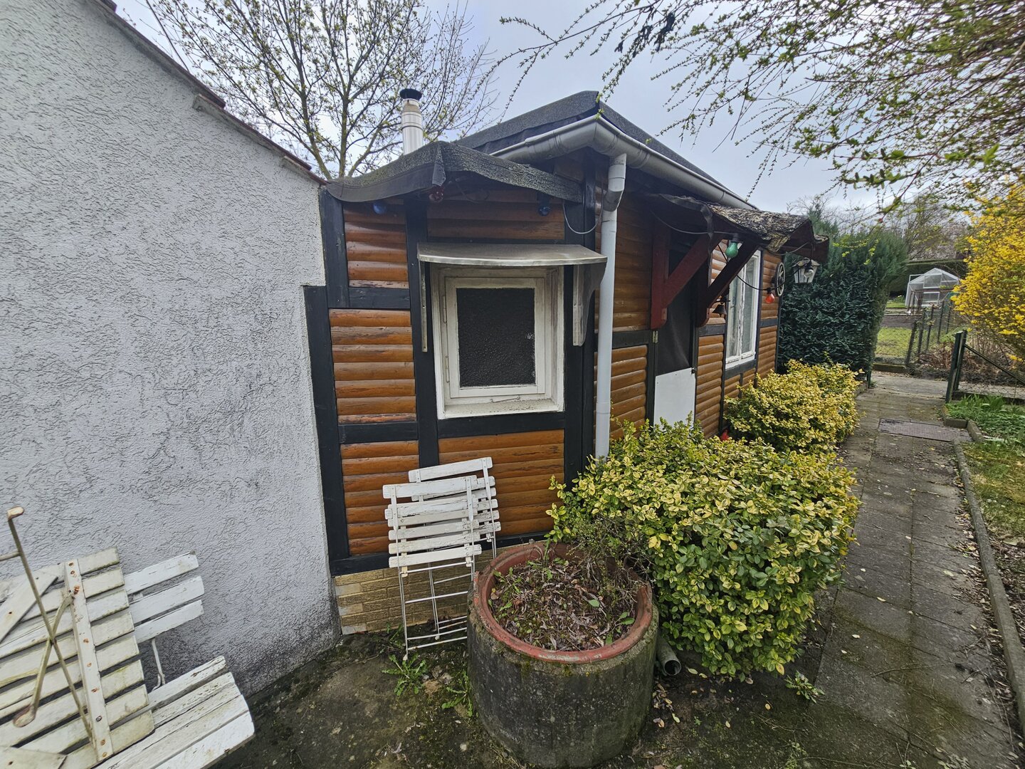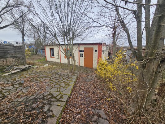 in kombinierter Bauweise aus Stein und Holz. Die Laube befindet sich in einem guten Zustand