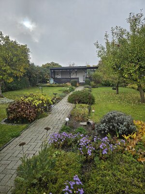 Sehr gepflegter Garten mit ca. 400qm Fläche und einer Gartenlaube in massiver Bauweise aus Stein.