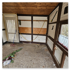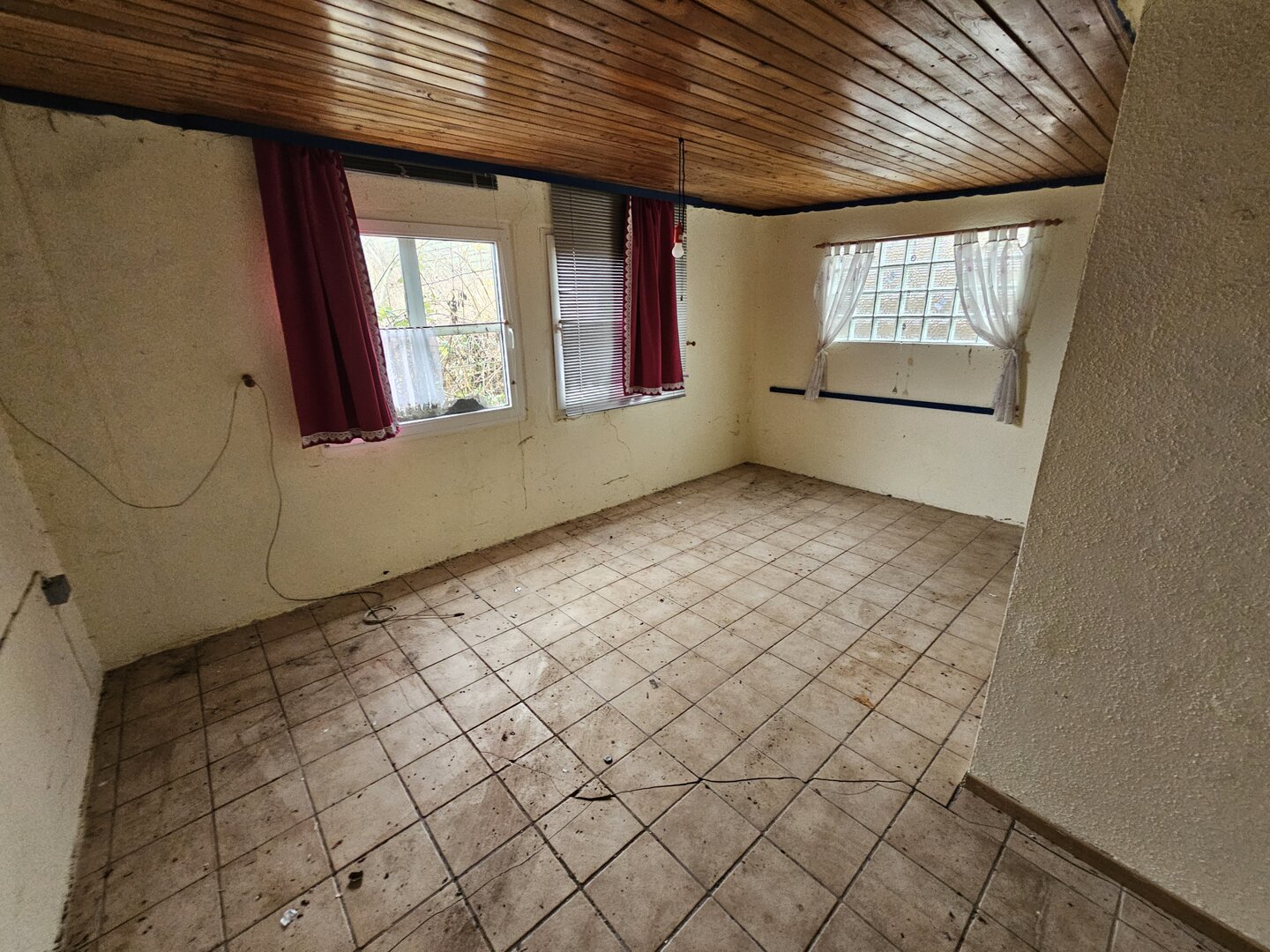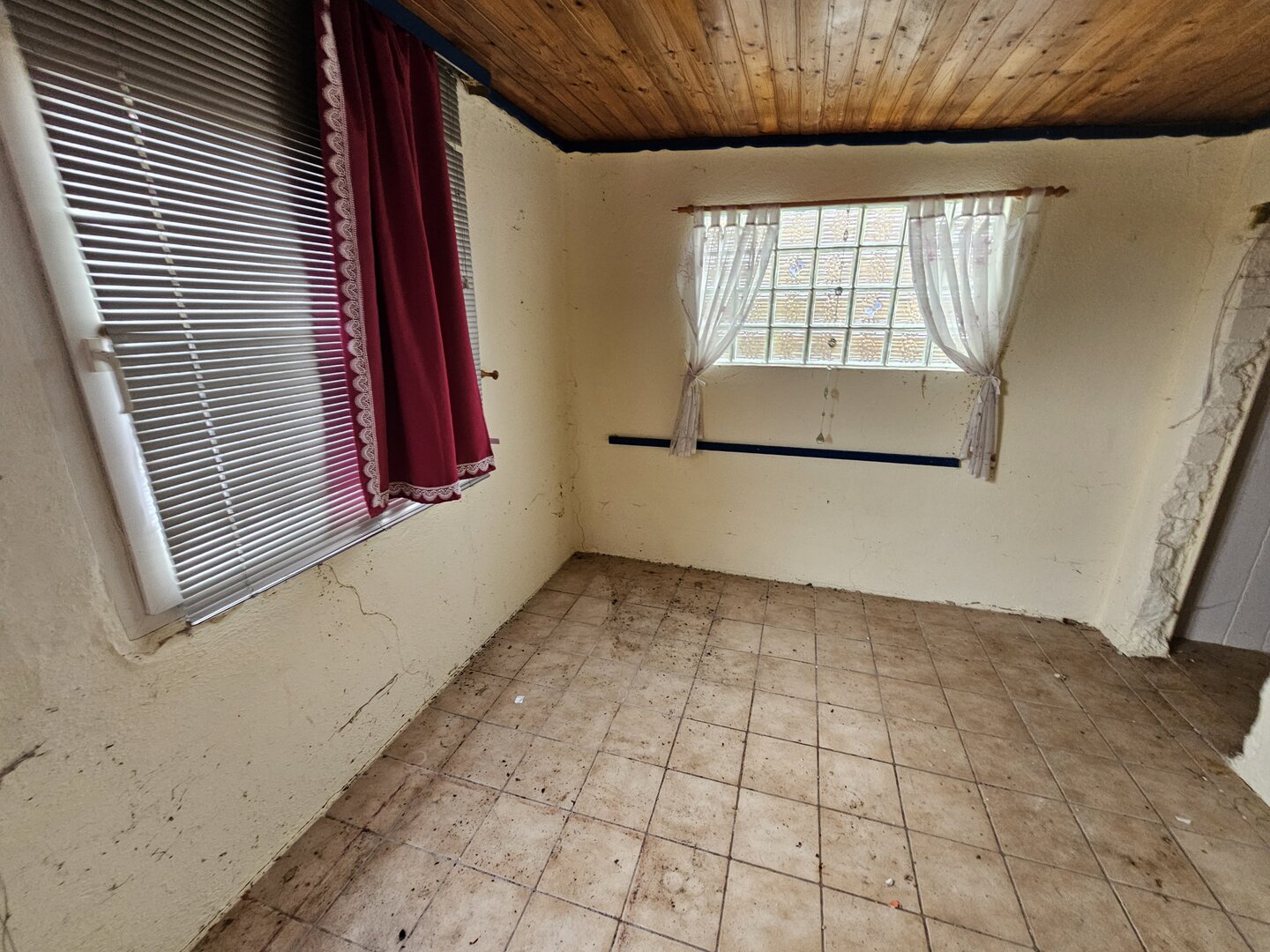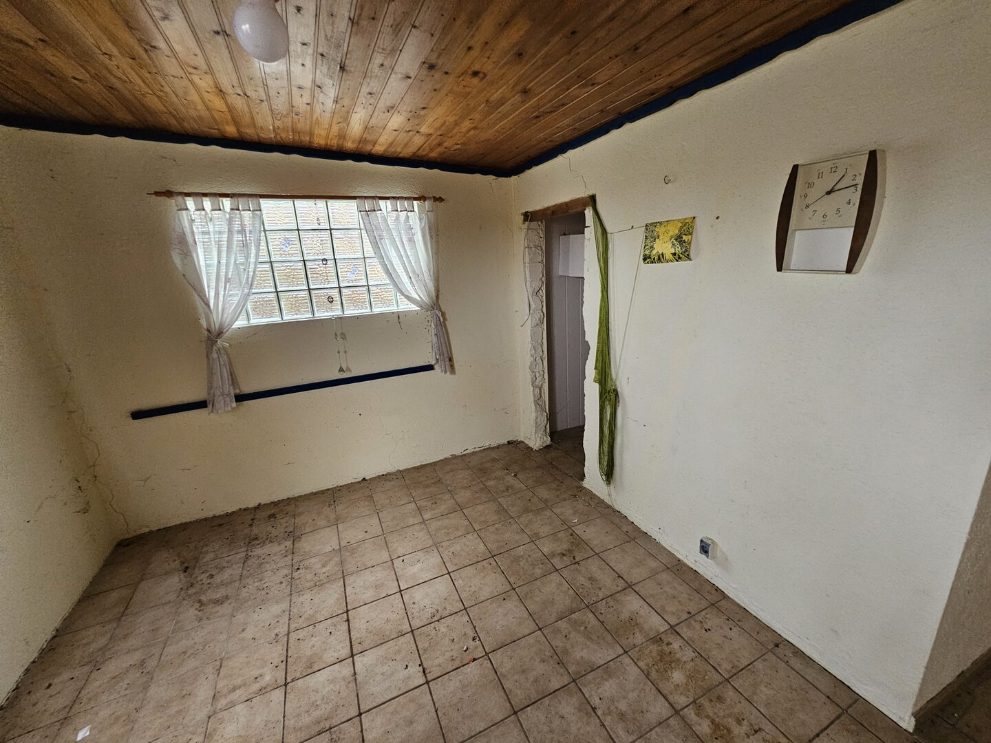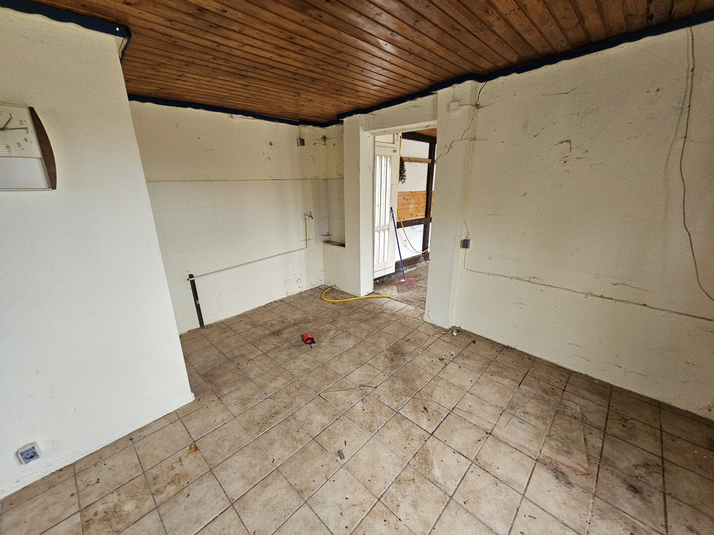 Die Laube ist renovierungsbedürftig und weist Setzrisse auf, stellt jedoch eine solide Basis dar.