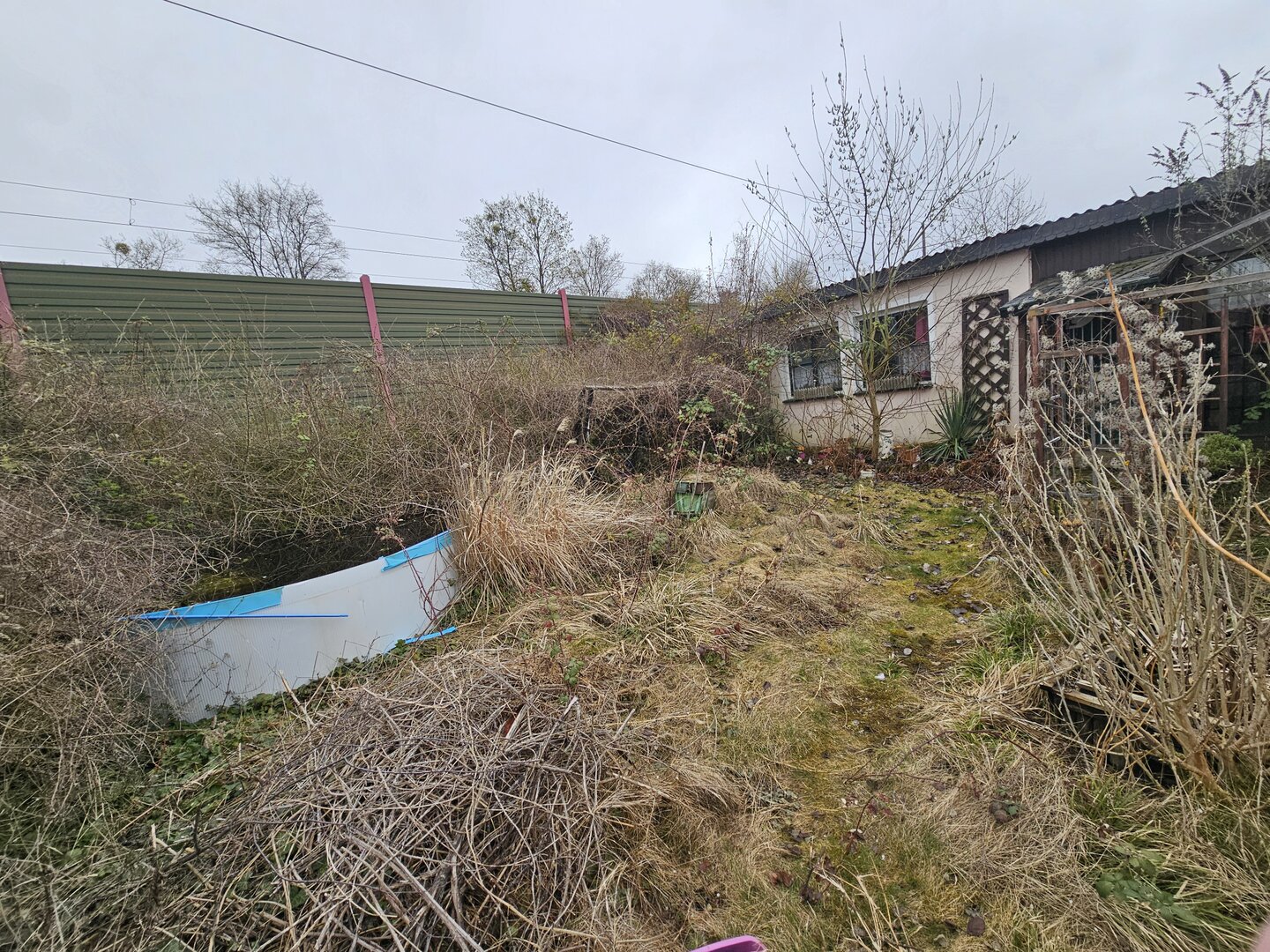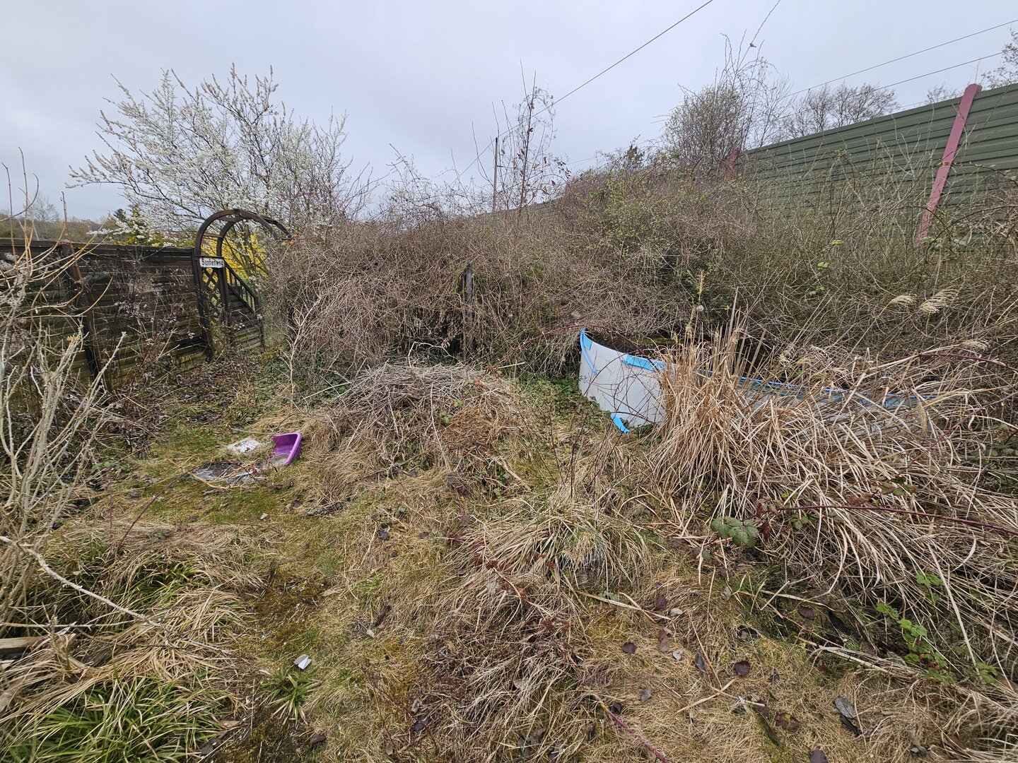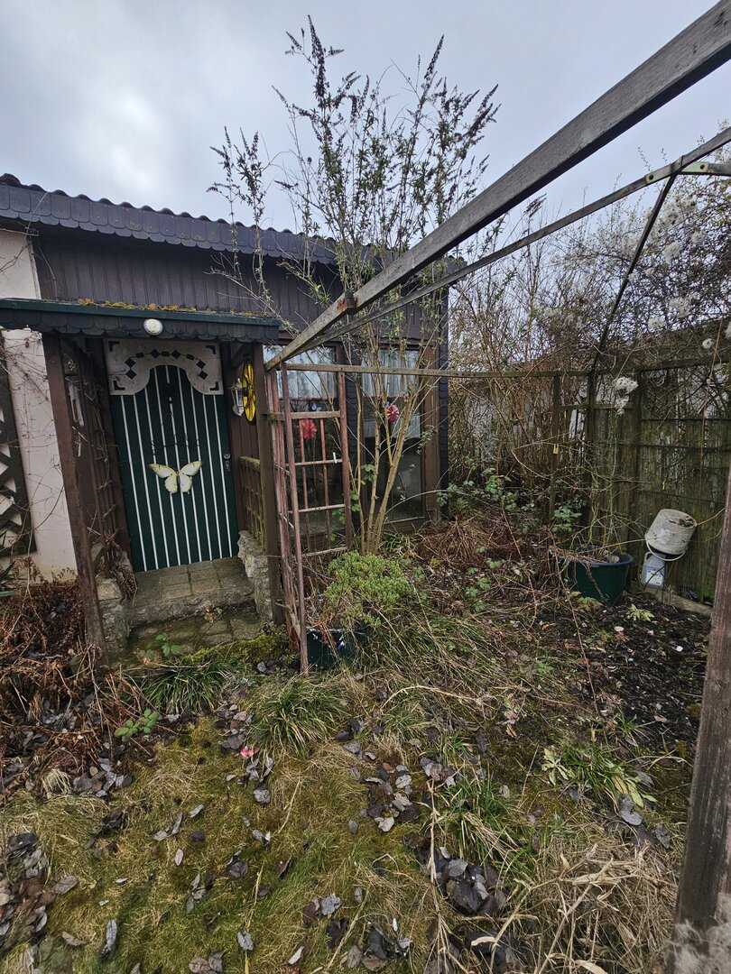 Die Gartenfläche selbst ist aktuell stark verwildert und vermüllt, sodass hier ein deutlicher Arbeitsaufwand erforderlich ist.